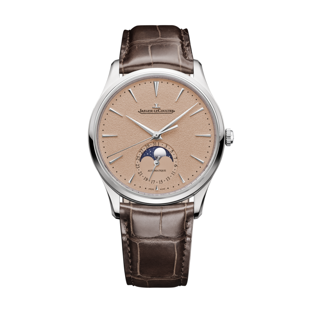 Tout en partageant les caractéristiques emblématiques de la Master Ultra Thin, chacune des nouvelles références conserve son caractère individuel, notamment en mettant en valeur sa complication par un élément contrastant sur l’affichage du cadran. La Master Ultra Thin Date se distingue ainsi par son disque de date blanc, inscrit dans un guichet rectangulaire et tranchant avec le coloris du cadran. La Master Ultra Thin Moon combine quant à elle l’affichage des phases de lune et de la date au sein d’un même compteur : une lune argentée éclaire un ciel étoilé bleu profond, entouré des index de date imprimés en noir sur la surface cuivrée.