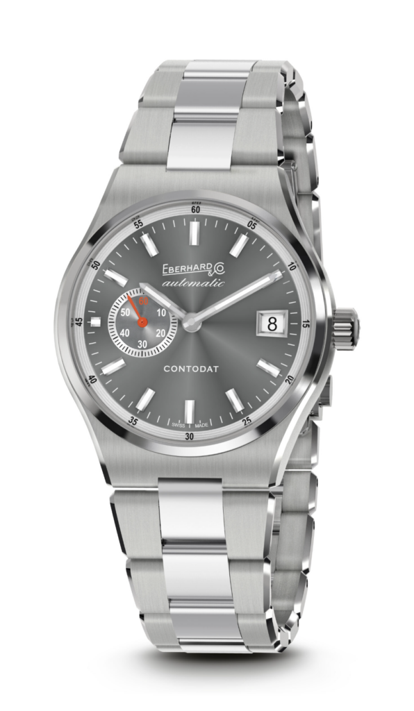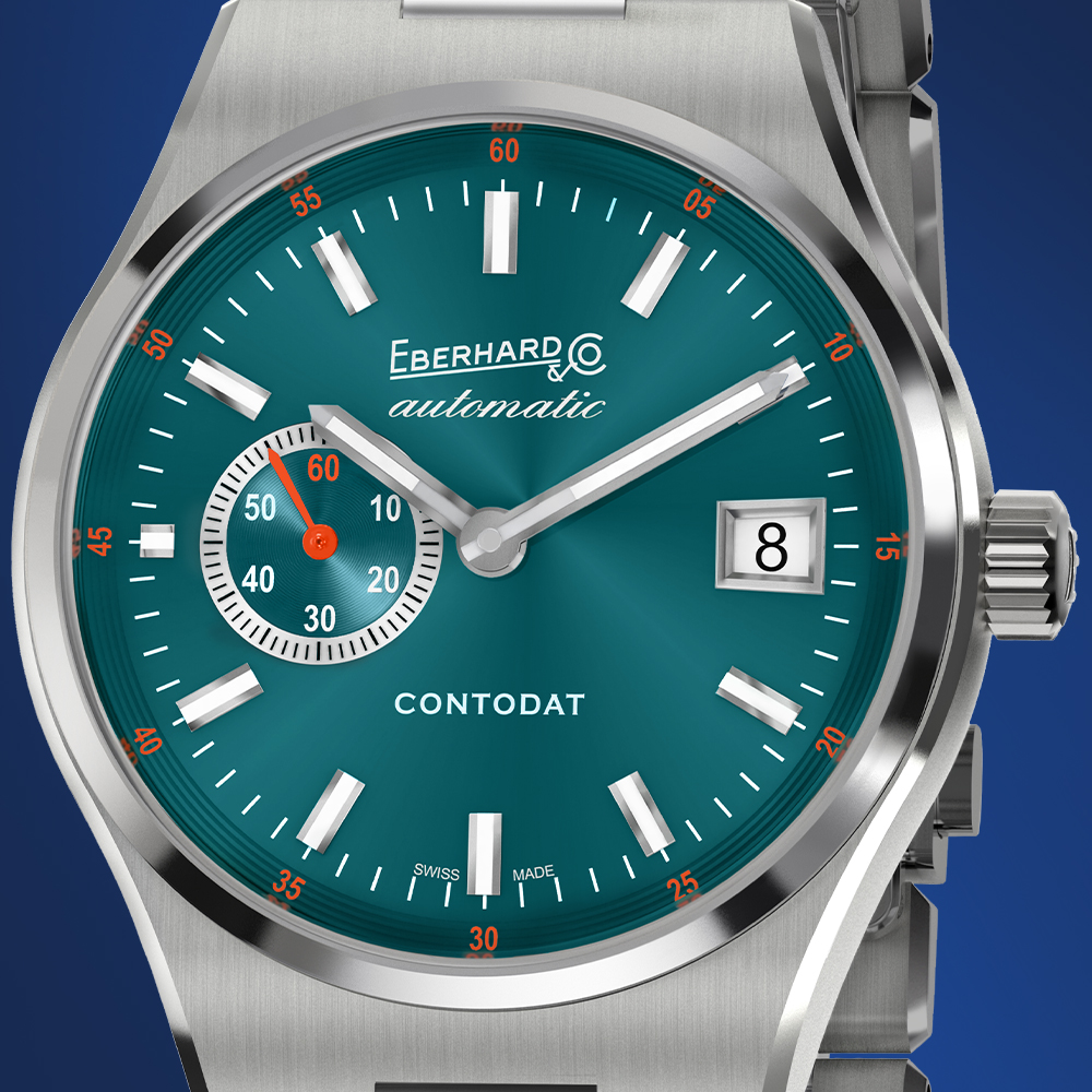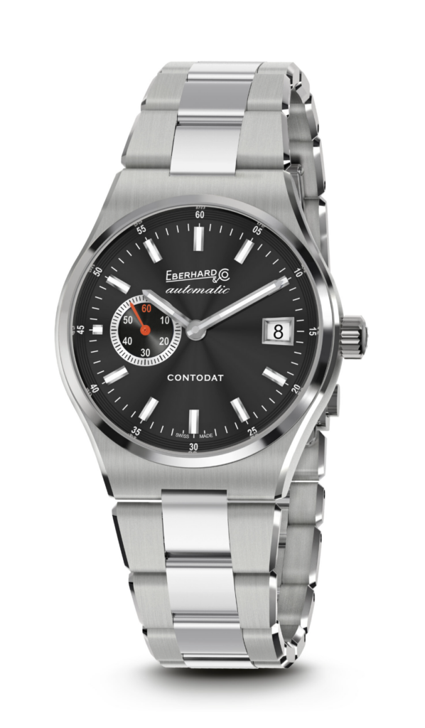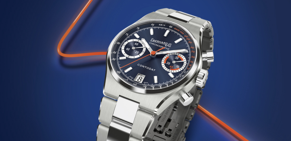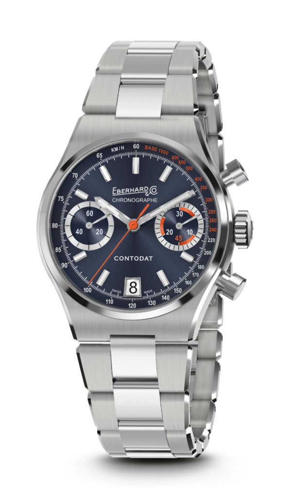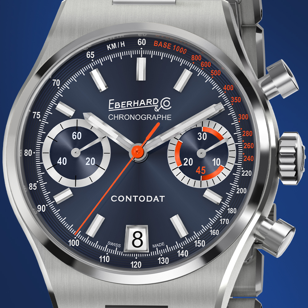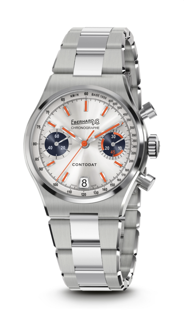 Le « Contodat Chronographe » est un chronographe mécanique à remontage automatique, au design accrocheur et riche en contrastes chromatiques, inspiré d’un modèle signé Eberhard & Co. datant de la seconde moitié des années 1970.