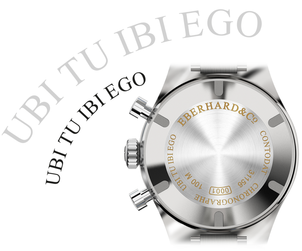 - FOND DU BOÎTIER VISSÉ, FINITION SATINÉE AU CENTRE POLIE SUR LA ZONE EXTÉRIEURE, PERSONNALISÉ AVEC DES GRAVURES DORÉES ET LA PHRASE LATINE « UBI TU IBI EGO »