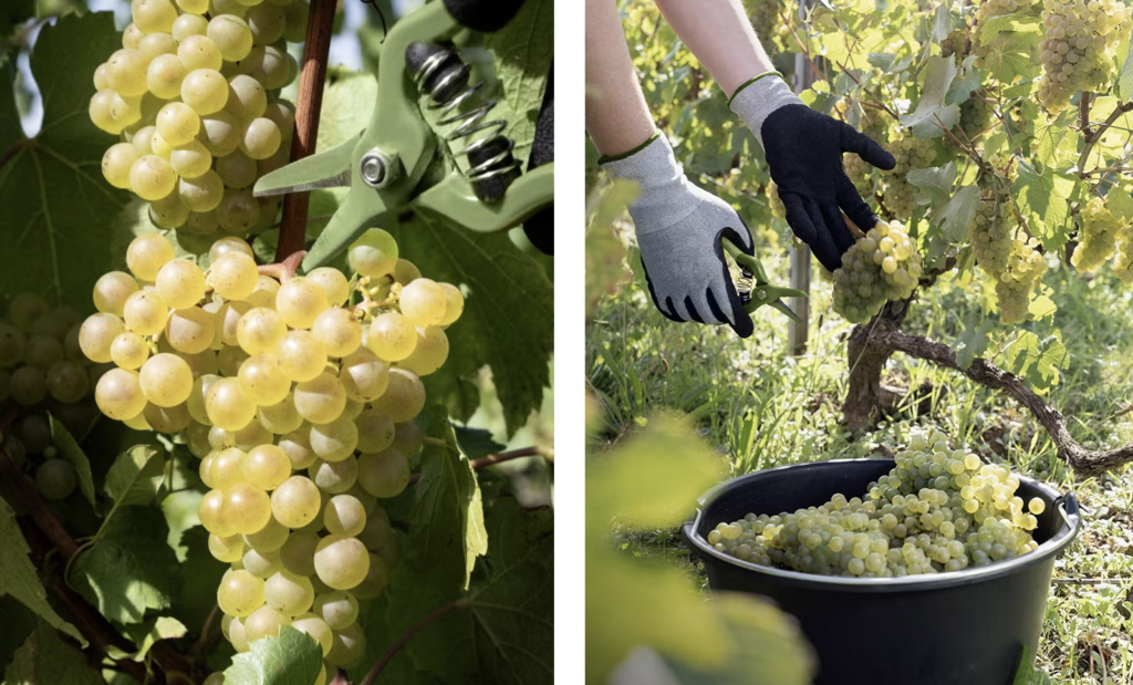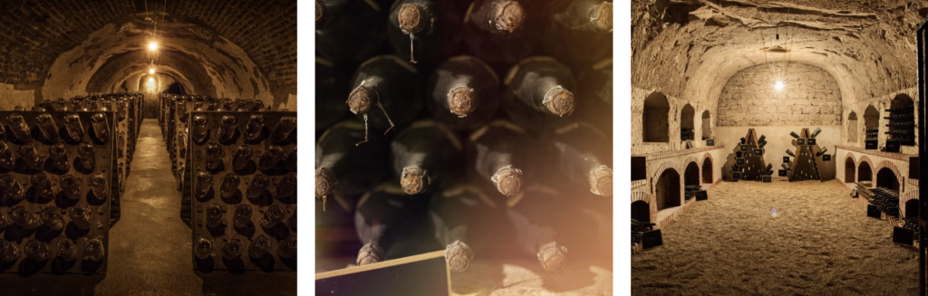 Récoltés à la main, à parfaite maturité, puis délicatement pressés au plus près du vignoble, les raisins sont ensuite transportés vers les caves de la Maison, à Épernay. C’est là, que le jus fraichement pressé va connaître sa première fermentation et devient ce que l’on appelle un vin clair.