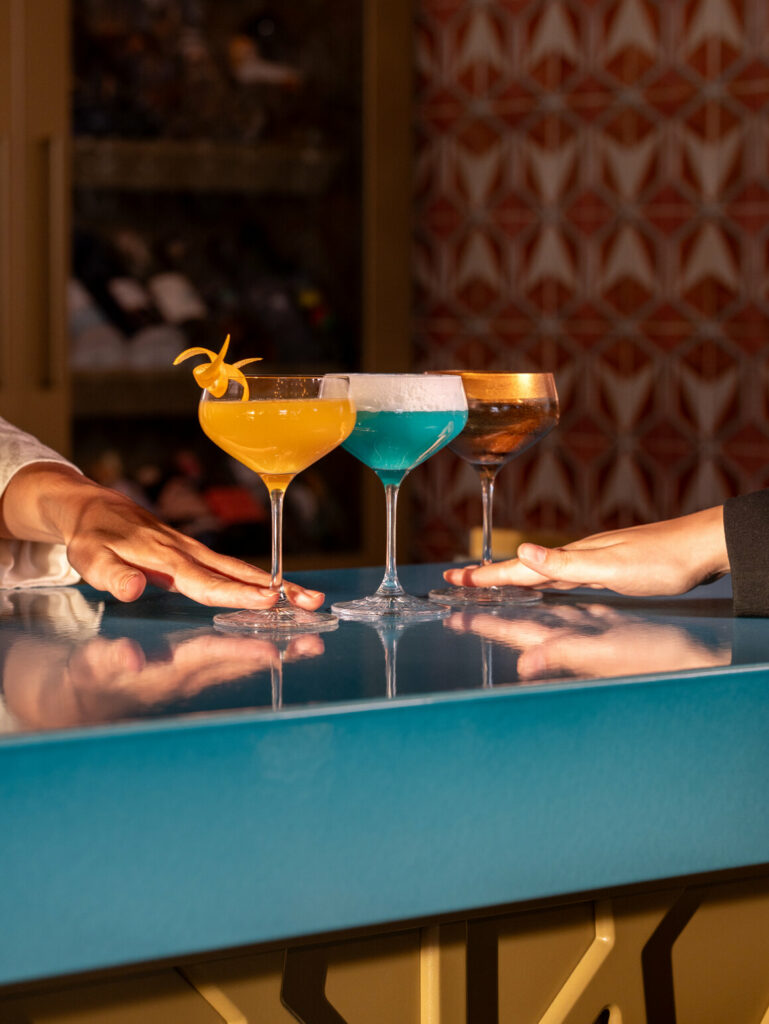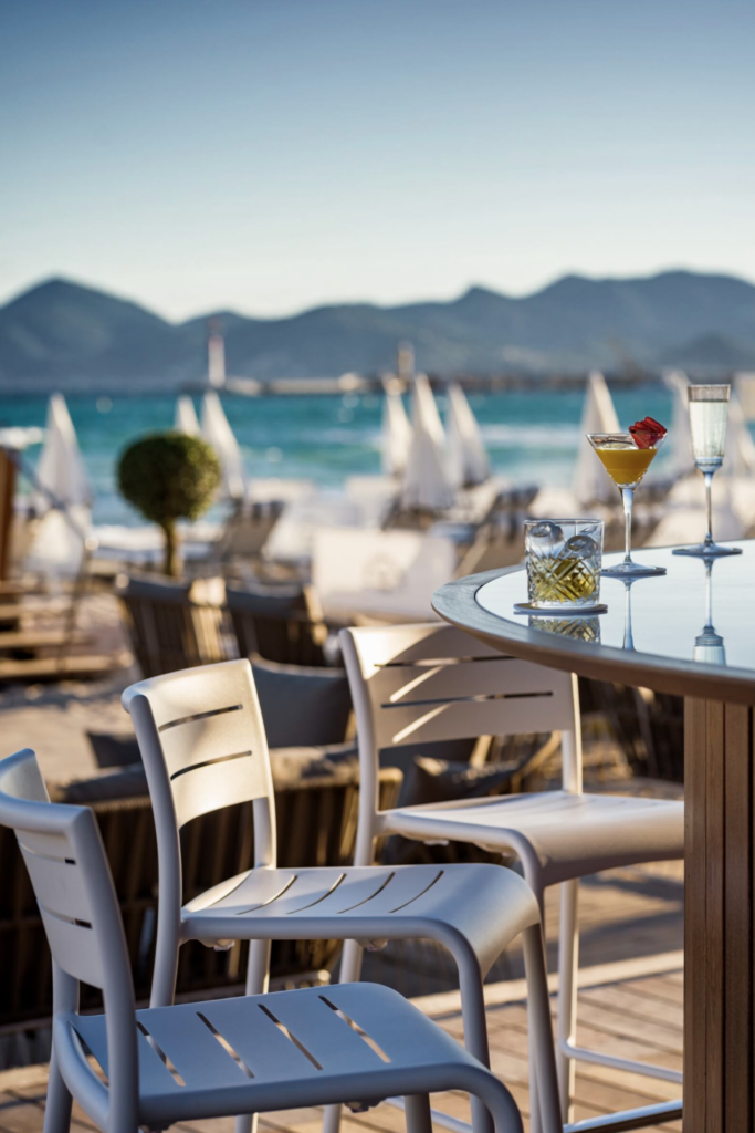 La terrasse panoramique, offrant une vue exceptionnelle sur la Croisette et la mer Méditerranée, constitue l’écrin idéal pour déguster cocktails et mocktails aux notes orientales, particulièrement au coucher du soleil, pour un moment suspendu, empreint de poésie et de légèreté.