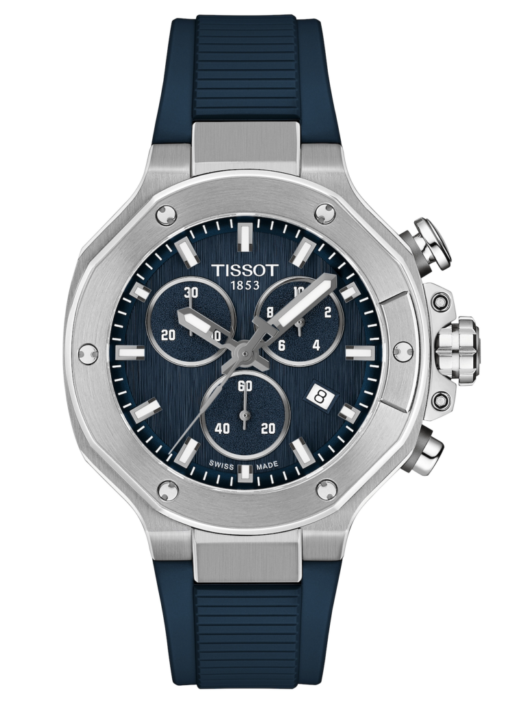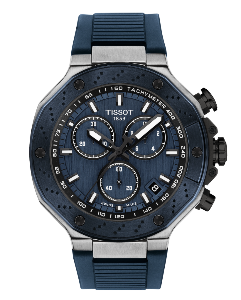 Au- delà des éditions MotoGP, la ligne de chronographes à quartz T – Race s’enrichit de trois nouveaux modèles qui apportent élégance et polyvalence à la collection. La version bleu foncé de 45 mm offre une identité visuelle audacieuse adaptée à une utilisation quotidienne. Elle se distingue par des index noirs qui renforcent son contraste et son caractère technique.