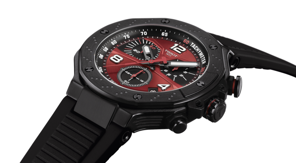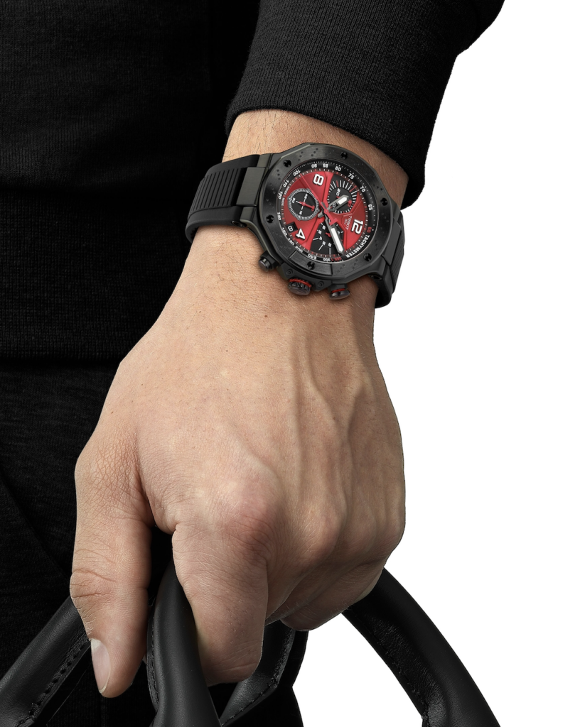 En complément de l’édition automatique, le chronographe à quartz T – Race MotoGP Édition Limitée apporte sa propre interprétation dynamique de la performance à grande vitesse. Sa boîte noire de 45 mm, dotée d’un traitement antireflet, améliore la lisibilité et attire le regard sur l’audacieux cadran rouge, rehaussé de détails en Super – LumiNova® . Le design présente des contrastes marqués et des lignes précises qui évoquent le mouvement et la tension des courses de compétition.